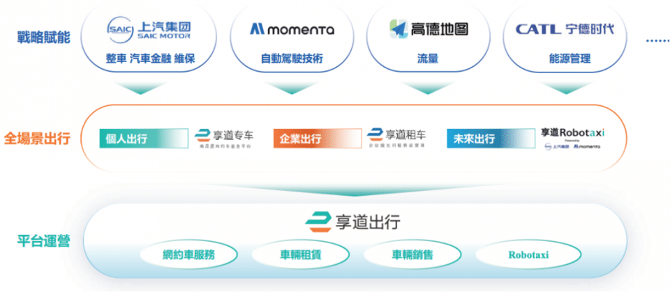 招股书显示,享道出行为中国全场景智慧出行平台,由上汽总公司发起成立,在发展过程中引入了 Momenta、高德、宁德时代等关键产业链投资者,业务覆盖个人出行 (网约车服务)、企业出行 (车辆租赁) 及未来出行 (即 Robotaxi 服务) 等多元场景需求。