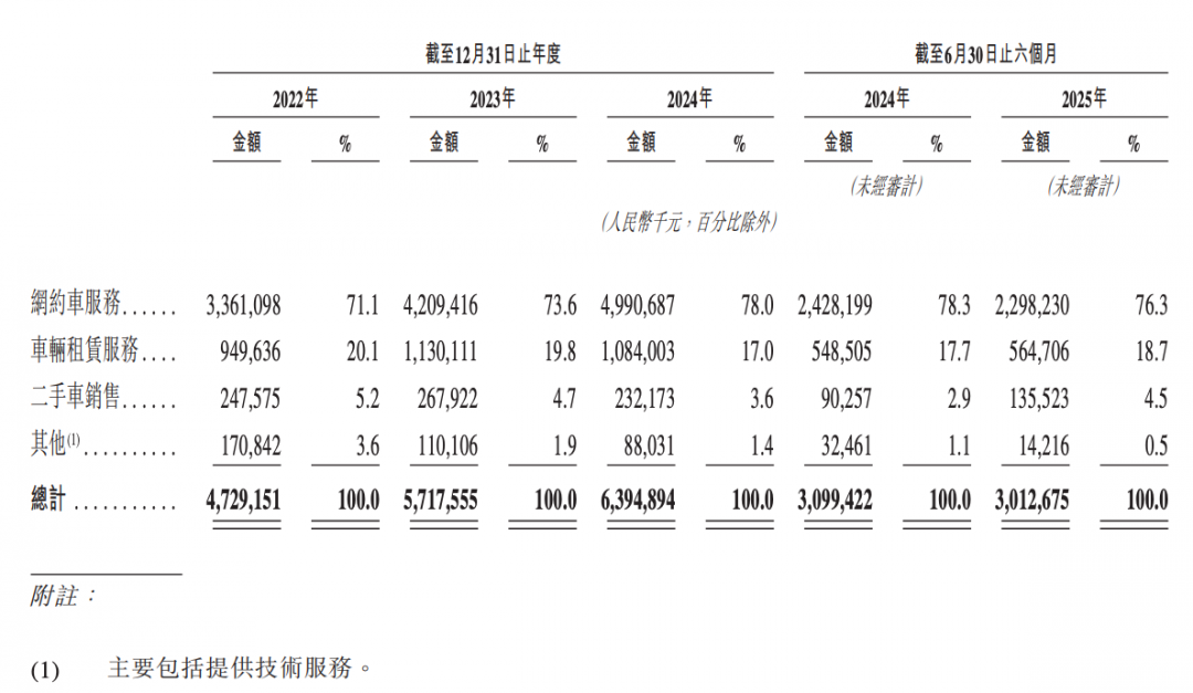 网约车服务为享道出行的核心业务,2022 年、2023 年、2024 年及 2025 年上半年,网约车服务收入占总营收的比重分别为 71.1%、73.6%、78.0%、78.3% 及 76.3%。
