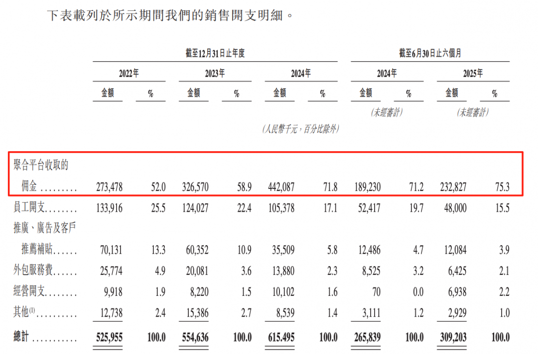 2022 年、2023 年、2024 年及 2025 年上半年,享道出行的销售开支占总营收的比重在 10% 左右,分别为 5.26 亿元、5.55 亿元、6.15 亿元及 3.09 亿元,其中聚合平台收取的佣金分别为 2.73 亿元、3.27 亿元、4.42 亿元及 2.33 亿元。作为对比,享道出行的研发开支分别为 1.71 亿元、1.69 亿元、8543.6 万元、4458.3 万元。也就是说,2025 年上半年,享道出行给聚合平台交的佣金是研发开支的 5 倍。