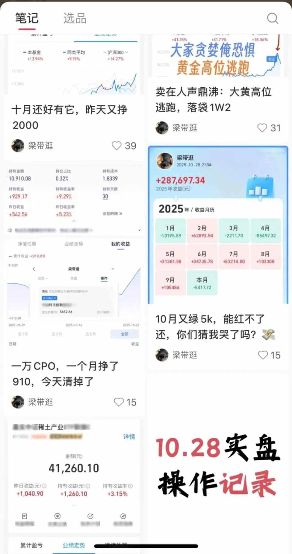 不止新基民,一些基金博主也热衷于短线操作。例如,在支付宝、小红书等平台粉丝超过 40 万的基金博主 「梁带逛」,每天实时晒出自己的买卖操作。她晒出的实盘持仓基金超过 100 只,平台数据显示,其 10 月以来操作基金 298 次,包括上百次卖出和转换。