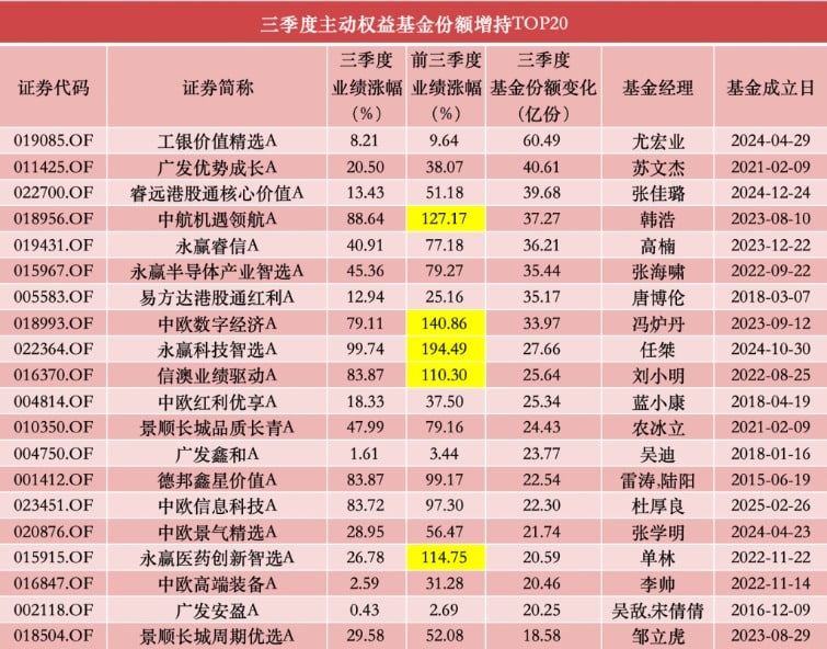 广发鑫和 A、德邦鑫星价值 A、中欧信息科技 A、中欧景气精选 A、永赢医药创新智选 A、中欧高端装备 A、以及广发安盈 A 的三季度增持份额均超 20 亿份;其中,永赢基金单林管理的永赢医药创新智选 A 前三季度业绩为 114.75%;景顺长城周期优选 A 三季度则获增持达 18.58 亿份。