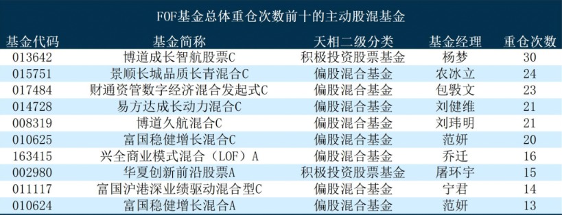 乔迁管理的兴全商业模式混合 (LOF)A、屠环宇管理的华夏创新前沿股票 A、宁君管理的富国沪港深业绩驱动混合型 C、范妍管理的富国稳健增长混合 A,被 FOF 基金重仓次数则均在 10 次以上。