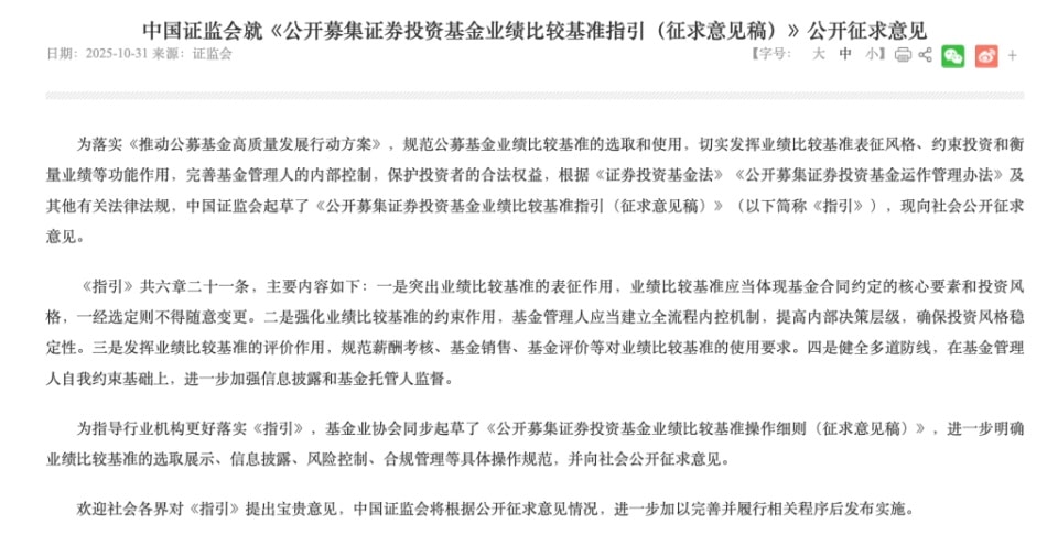 2025 年 10 月 31 日,中国证监会发布 《公开募集证券投资基金业绩比较基准指引 (征求意见稿)》(以下简称 《指引》),中国证券投资基金业协会同步发布 《公开募集证券投资基金业绩比较基准操作细则 (征求意见稿)》(以下简称 《细则》),要求公募基金产品必须明确设定业绩比较基准,并对业绩比较基准的变更条件、投资风格监测、绩效考核、销售展示及托管人监督等作出系统性规范,剑指 「基准随意设定、风格漂移」 的乱象。