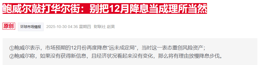 但在决议后的新闻发布会上,美联储主席鲍威尔警告,不能保证会进一步降息,理由是政府关门导致经济报告中断,并提到货币政策决策者之间存在严重分歧。