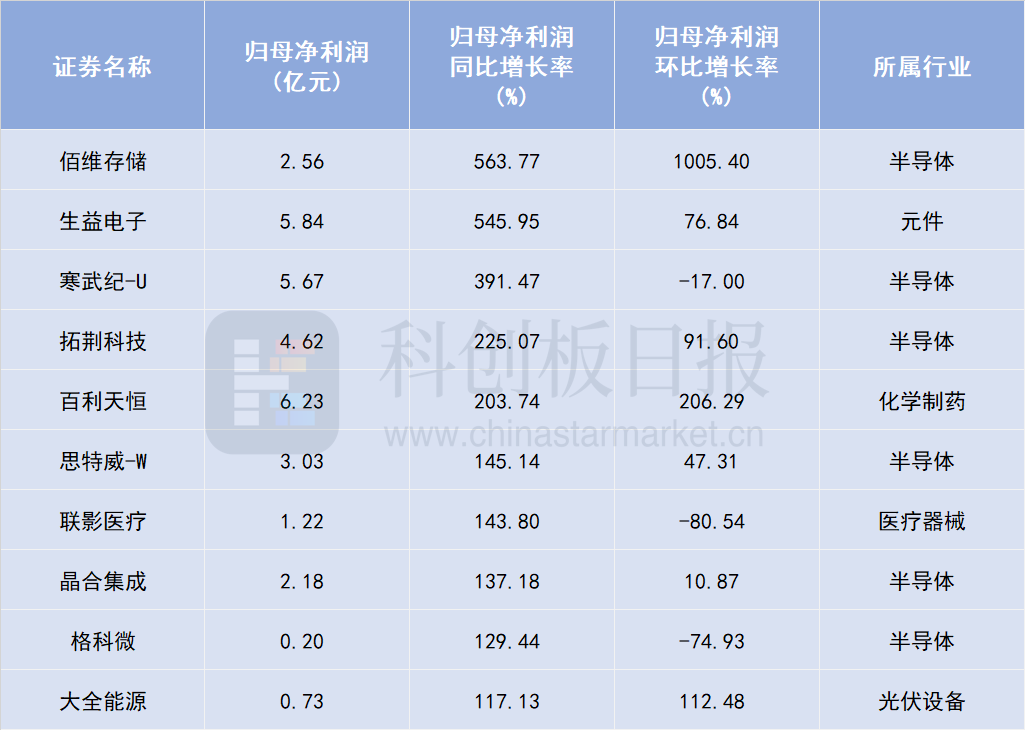 在 Q3 净利润同比增幅前十中,半导体行业公司占据了过半席位,包括佰维存储 (存储芯片)、寒武纪 (AI 芯片)、拓荆科技 (半导体设备)、思特威 (CIS)、晶合集成 (代工)、格科微 (CIS);其余则为医药医疗、电子元件、光伏行业公司。