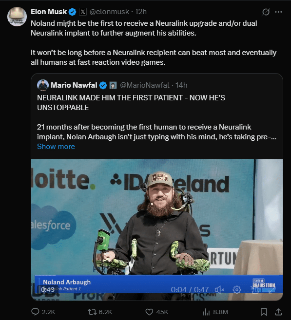 对此,马斯克表示:「诺兰可能是首个接受 Neuralink 升级,并且可能将会是首个为了提升自身能力,而植入双 Neuralink 设备的人。」 他强调,在不久的将来,Neuralink 脑机接口的植入者就能在快节奏的电子游戏中击败大多数甚至所有人类。