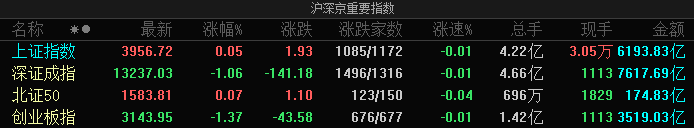 黑马财经财经讯 11 月 3 日,三大指数涨跌不一,沪指翻红,创业板指跌超 1%,黄白线分化明显。截至午间收盘,沪指涨 0.05%,深成指跌 1.06%,创业板指跌 1.37%。量能大幅萎缩,沪深两市半日成交额 1.38 万亿,较上个交易日缩量 1755 亿。