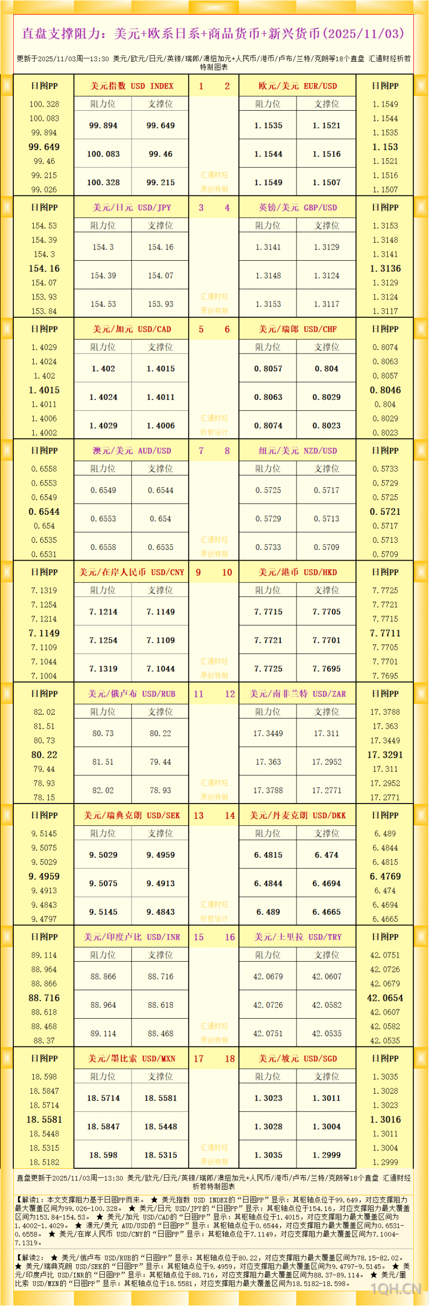 一张图看直盘支撑阻力:美元+欧系日系+商品货币+新兴货币,更新于 2025 年 11 月 3 日周一 13:30,具体美元/欧元/日元/英镑/瑞郎/澳纽加元+人民币/港币/卢布/兰特/克朗等 18 个直盘,更多详见汇通财经析若特制图表中的内容。