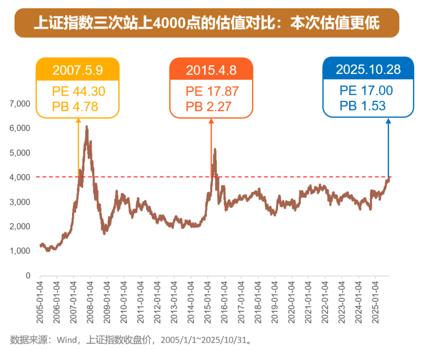 判断市场贵不贵,核心看估值,也就是市盈率 PE 和市净率 PB。截至 2025 年 10 月 28 日,上证指数的 PE 估值是 17,PB 估值 1.53。低于 2015 年估值水平,且显著低于 2007 年估值水平。简单说,现在的 4000 点,比前两次同点位 「便宜」 不少,泡沫感更弱。