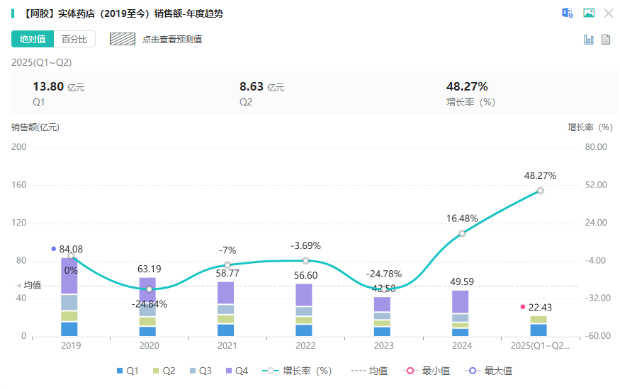 阿胶近两年销售情况开始逐年回升。摩熵医药数据显示,2024 年阿胶实体药店销售额 49.59 亿元,同比增幅 16.48%,2025 年上半年销售额为 22.43 亿元,同比增加 48.27%。