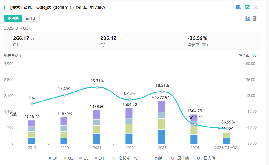 安宫牛黄丸也有类似的表现,该产品在 2023 年达到销售顶峰,实体药店销售额高达 51.44 亿元;2024 年则降至 42.56 亿元,同比下降 17.24%;2025 年上半年进一步下滑至 19.14 亿元,同比减少 16.08%。