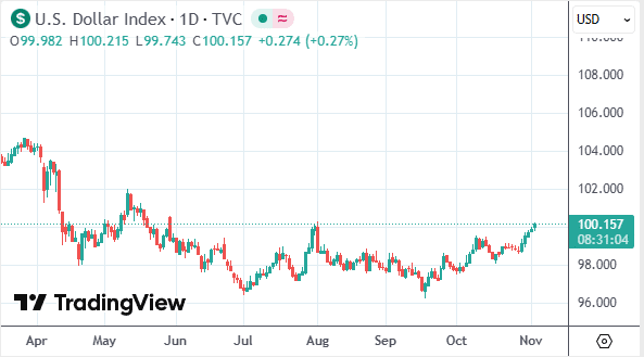 财联社 11 月 4 日讯 (编辑 赵昊)周二 (11 月 4 日) 欧洲时段,美元指数自 8 月初以来首度升破 100 关口,最高报 100.21,为三个月来的最高水平。