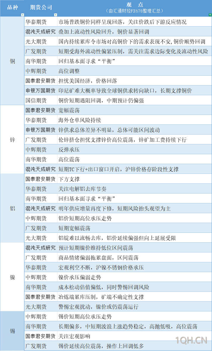 期货公司观点汇总一张图:11 月 5 日有色系 (铜、锌、铝、镍、锡等)。更多详见本文的汇通财经特制图。
