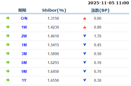 上海银行间同业拆放利率 (Shibor) 短期品种波动不大,14 天品种微跌。具体来看,隔夜 Shibor 上涨 0.00BP,报 1.3150%;7 天 Shibor 上涨 0.80BP,报 1.4230%;14 天 Shibor 下跌 1.70BP,报 1.4610%。