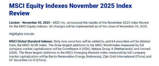 北京时间 11 月 6 日早间,国际指数编制公司 MSCI 公布了 11 月指数审核变更结果。在本次调整中,MSCI 中国A 股指数新纳入 17 只标的,剔除 16 只。本次调整结果将于 2025 年 11 月 24 日收盘后生效。