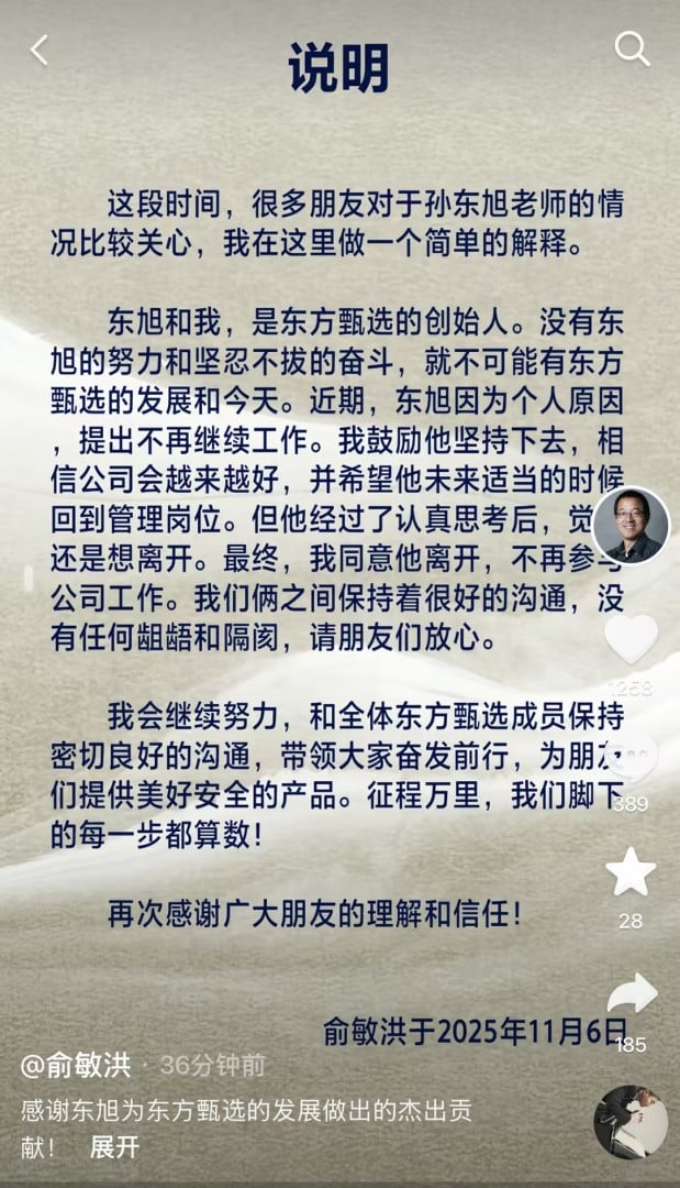 这段时间,很多朋友对于孙东旭老师的情况比较关心,我在这里做一个简单的解释。东旭和我,是东方甄选的创始人。没有东旭的努力和坚忍不拔的奋斗,就不可能有东方甄选的发展和今天。近期,东旭因为个人原因,提出不再继续工作。我鼓励他坚持下去,相信公司会越来越好,并希望他未来适当的时候回到管理岗位。但他经过了认真思考后,觉得还是想离开。最终,我同意他离开,不再参与公司工作。我们俩之间保持着很好的沟通,没有任何龃龉和隔阂,请朋友们放心。我会继续努力,和全体东方甄选成员保持密切良好的沟通,带领大家奋发前行,为朋友们提供美好安全的产品。