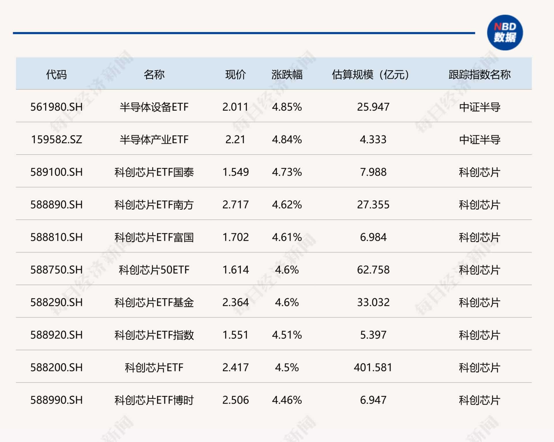 ETF 涨跌幅方面,半导体、芯片相关 ETF 涨超 4%。