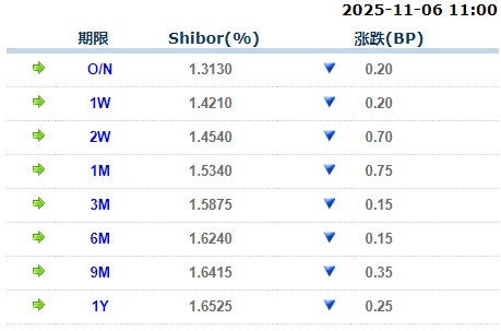 上海银行间同业拆放利率 (Shibor) 短期品种均微跌,延续窄幅震荡。具体来看,隔夜 Shibor 下跌 0.20BP,报 1.3130%;7 天 Shibor 下跌 0.20BP,报 1.4210%;14 天 Shibor 下跌 0.70BP,报 1.4540%。