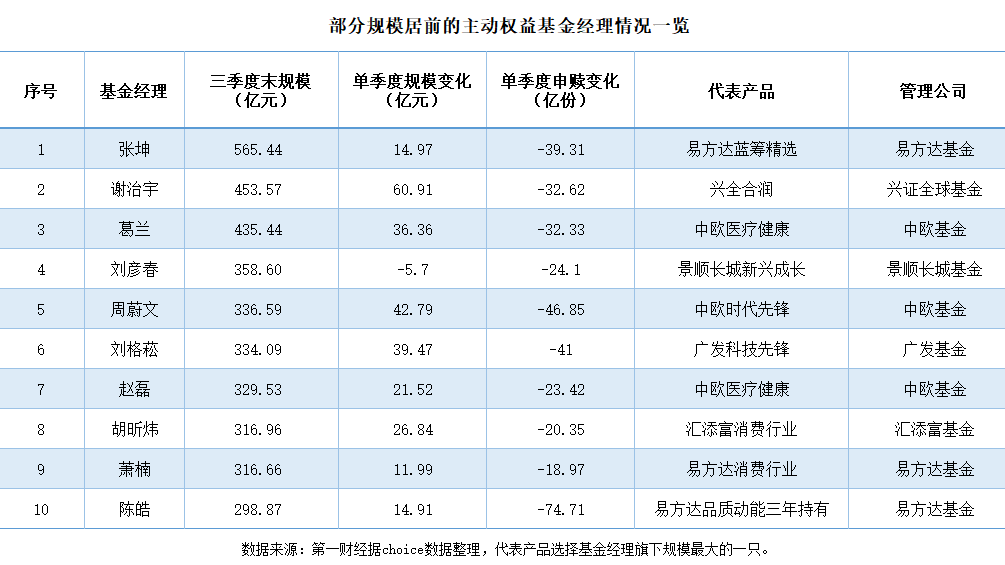 与此同时,多位顶流基金经理管理规模出现回升。易方达基金张坤以 565.44 亿元的管理规模稳坐头把交椅,单季度规模增长近 15 亿元;谢治宇、葛兰则分别以 453.57 亿元、435.44 亿元重归 「400 亿+」 梯队;周蔚文、刘格菘、汇添富基金胡昕炜等也悉数重返 300 亿阵营。