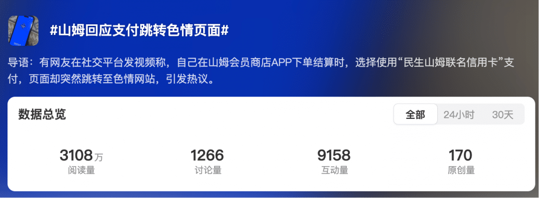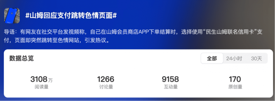【旭才科技】11 月 7 日消息,近日,有网友在社交平台发视频称,自己在山姆会员商店 APP 下单结算时,选择使用 「民生山姆联名信用卡」 支付,页面却突然跳转至色情网站,引发热议。