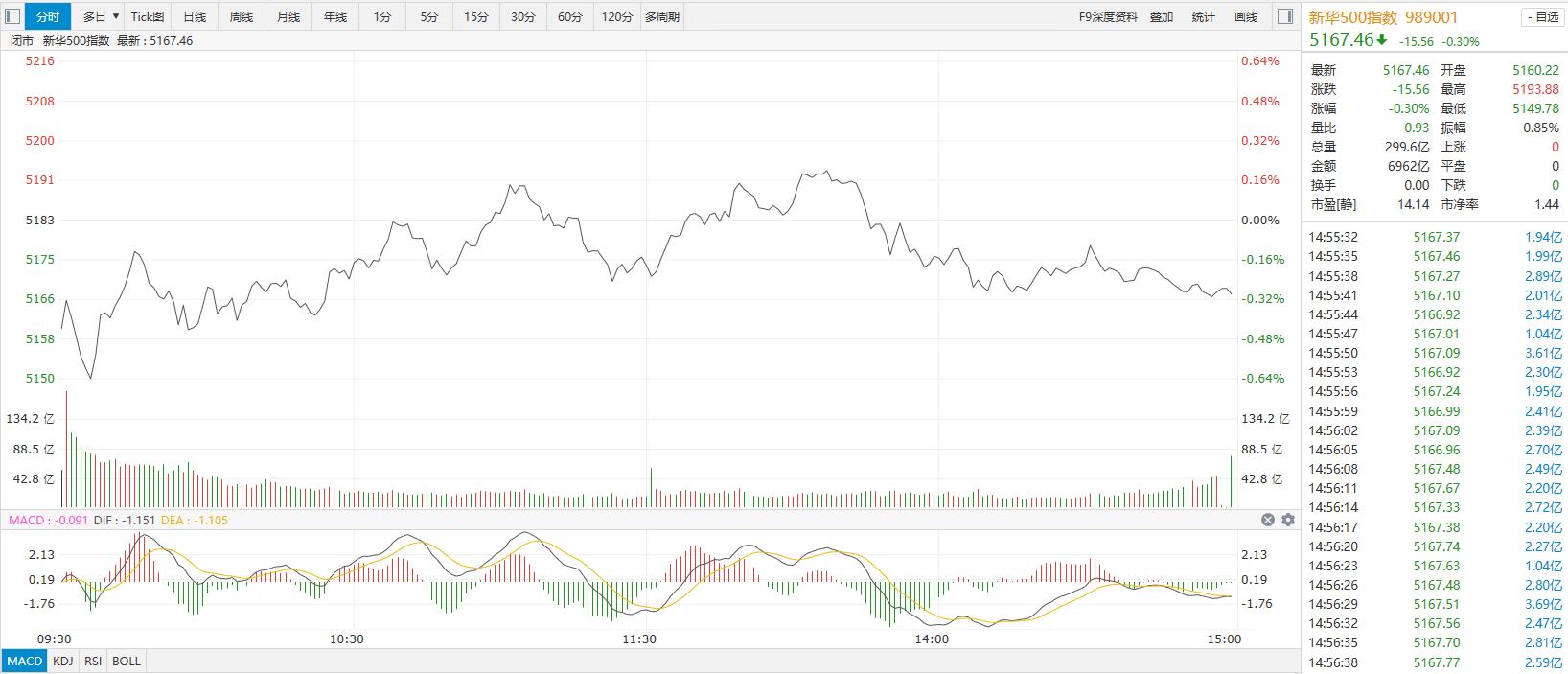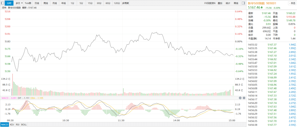走势上看,新华 500 指数 (989001)7 日早间低开,随后震荡上行并一度翻红,午后指数震荡下挫,最终小幅收跌。指数盘中最高触及 5193.88 点,最低触及 5149.78 点,成分股全天总成交额报 6962 亿元,成交额较上一交易日有所减少。