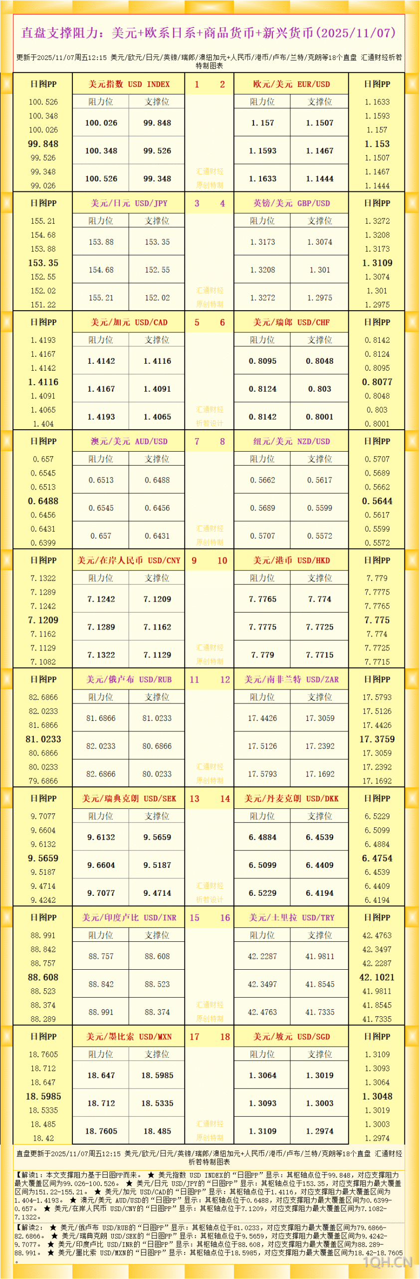 一张图看直盘支撑阻力:美元+欧系日系+商品货币+新兴货币,更新于 2025 年 11 月 7 日周五 12:15,具体美元/欧元/日元/英镑/瑞郎/澳纽加元+人民币/港币/卢布/兰特/克朗等 18 个直盘,更多详见汇通财经析若特制图表中的内容。
