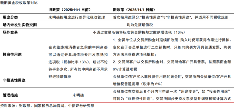 ▍2025 年 11 月 1 日,财政部、国家税务总局发布 《关于黄金有关税收政策的公告》 税收新政,引发行业震动。新规从源头区分投资性与非投资性用途,进行分类管理,取代已沿用 20 余年的原有政策,或将通过影响产业链价值分配及加速合规化进程重塑行业格局。