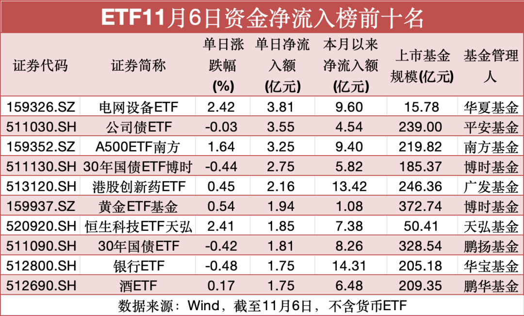 从具体资金流向上看,11 月 6 日,跟踪电网设备、中证 A500、港股创新药相关指数的 ETF 资金净流入居前,跟踪科创板、创业板以及芯片类指数的相关 ETF 遭遇净赎回。