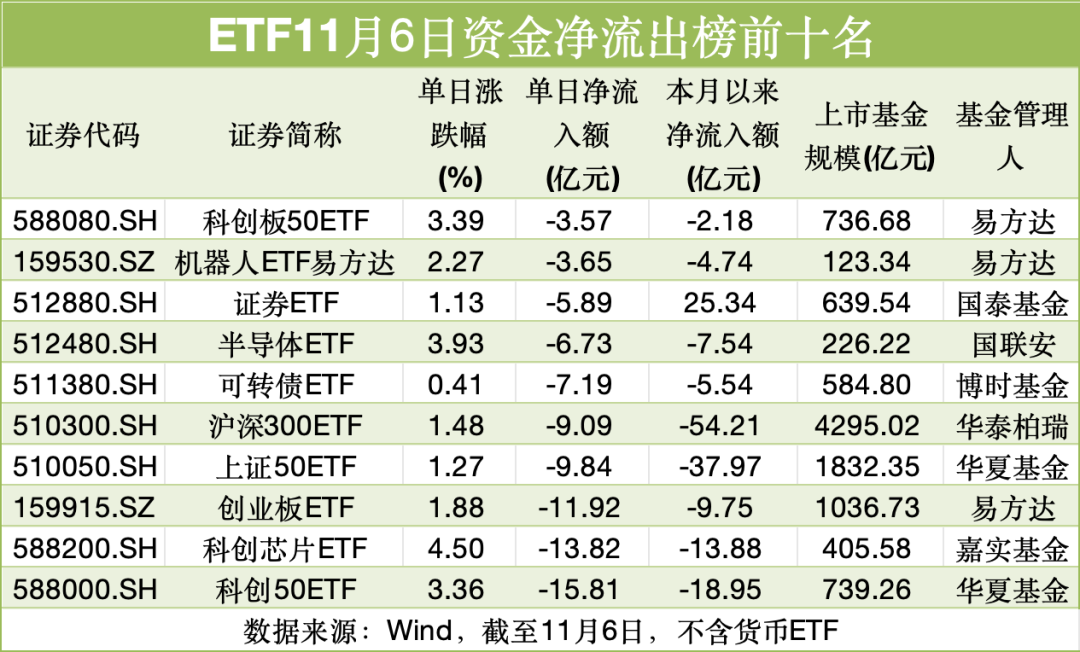 多只跟踪科创 50 指数、创业板指数、科创芯片指数、上证 50 指数、沪深 300 指数的 ETF 位居资金净流出榜前列。