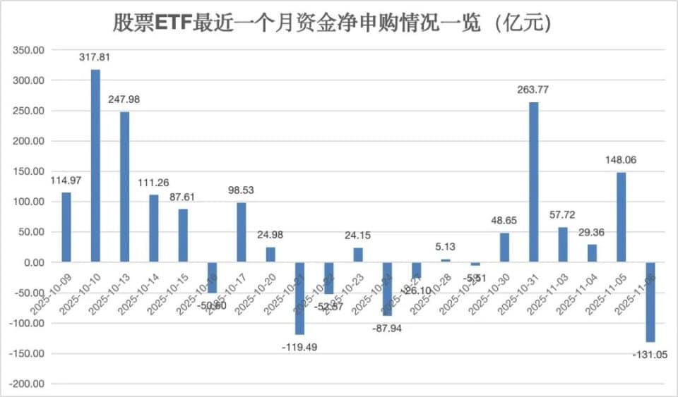 据银河证券基金研究中心数据统计,11 月 6 日,全市场股票 ETF(包含跨境 ETF) 整体资金净流出超 131 亿元。