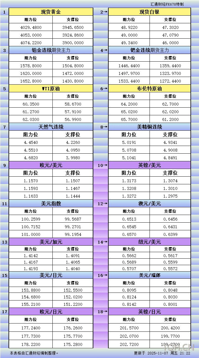 文章来源:一期货 <br><div class="content-txt">11月7日美市美市更新的黄金、白银、铂金、钯金、原油、天然气、铜(商品)以及:美元指数、欧元、英镑、日元、瑞郎、澳元、加元、纽元(热门货币对)的支撑阻力位一览。<br></div>